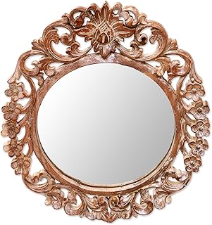 NOVICA 手彫り 天然スアウッド 花柄 ラウンドウォールミラー インドネシア産 ブラウン 「Gianyar Garden」