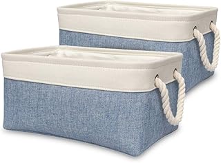 [Amazonブランド] Umi(ウミ)収納バスケット 2個セット 収納かご 約幅35×奥行25×高さ17㎝ インナーケース 小物・おもちゃ・衣類収納 折りたたみ リンネル素材 耐湿 綿ロープ取っ手付き ブルー/ホワイト 長方形 …