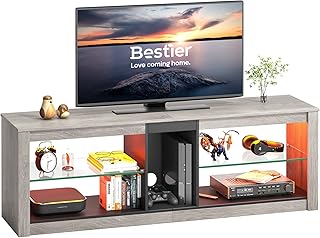Bestier テレビ台 テレビスタンド tvスタンド テレビラック 幅110㎝ 32~50V対応 AV ゲーム機収納 木製 ローボード ロータイプ おしゃれ モダン リビング 収納棚付き LEDライト付き (グレー)